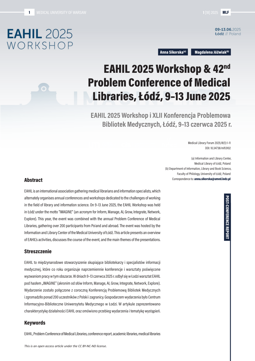 EAHIL is an international association bringing together medical librarians and information specialists, which alternately organises annual conferences and workshops dedicated to the challenges of working in the field of library and information science. On 9–13 June 2025, the EAHIL Workshop was held in Łódź under the motto “IMAGINE” (an acronym for Inform, Manage, AI, Grow, Integrate, Network, Explore). This year, the event was combined with the annual Problem Conference of Medical Libraries, gathering over 200 participants from Poland and abroad. The event was hosted by the Information and Library Center of the Medical University of Łódź. This article presents an overview of EAHIL’s activities, discusses the course of the event, and the main themes of the presentations.